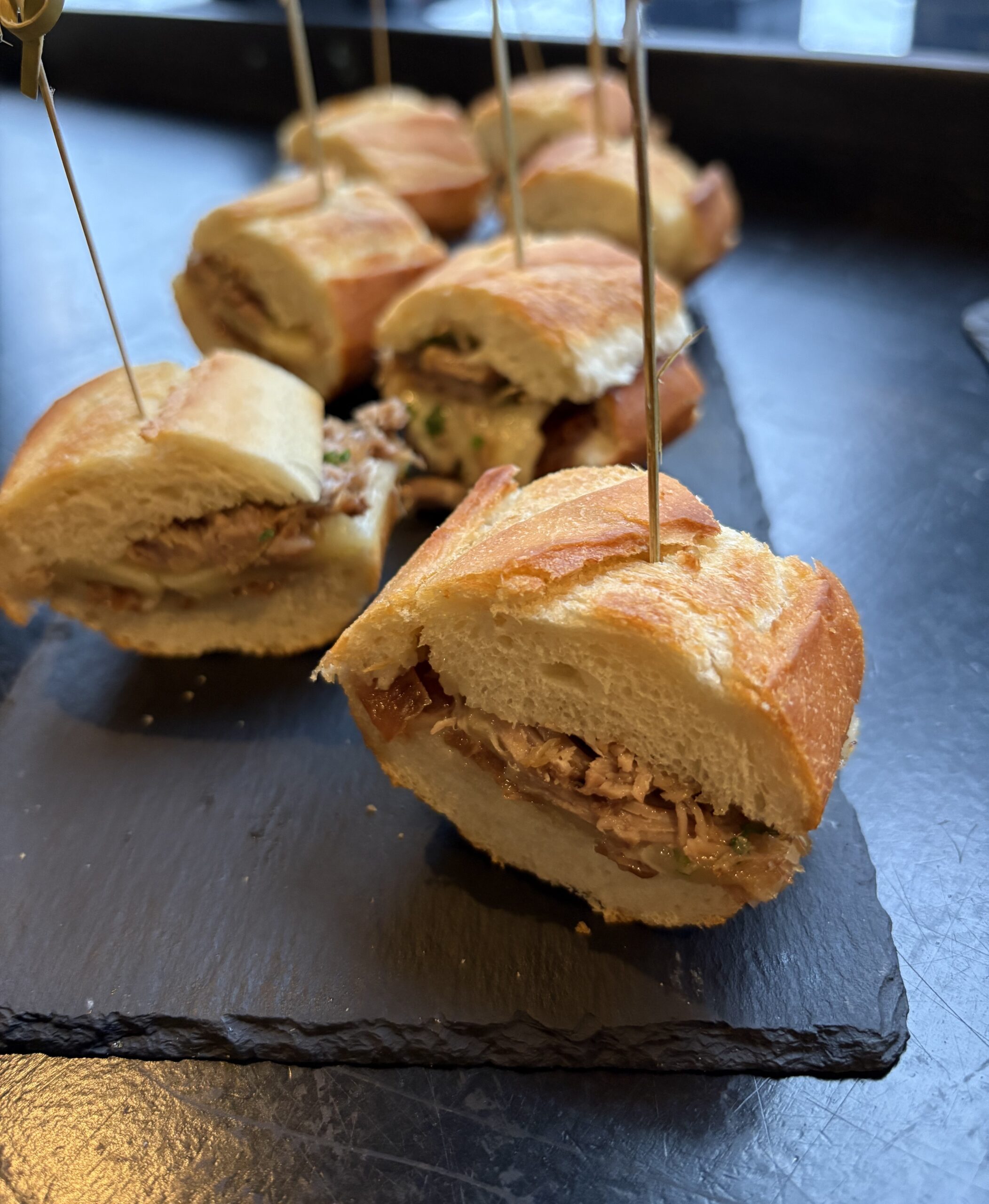Ingrédients : baguette, oignons caramélisés, canard confit maison, cheddar, mayonnaise et ciboulette