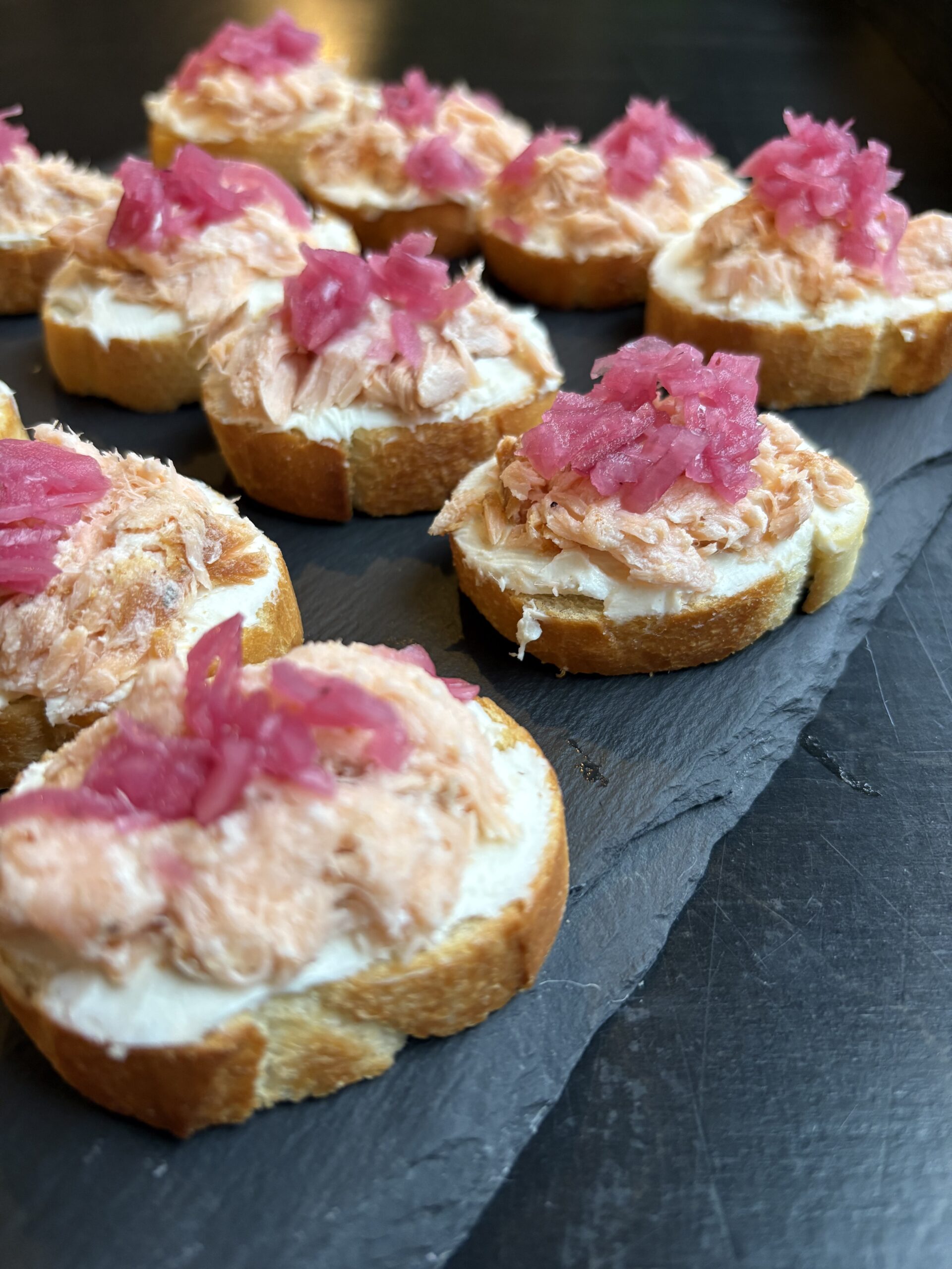 Ingrédients : baguette, fromage à la crème et oignons marinés