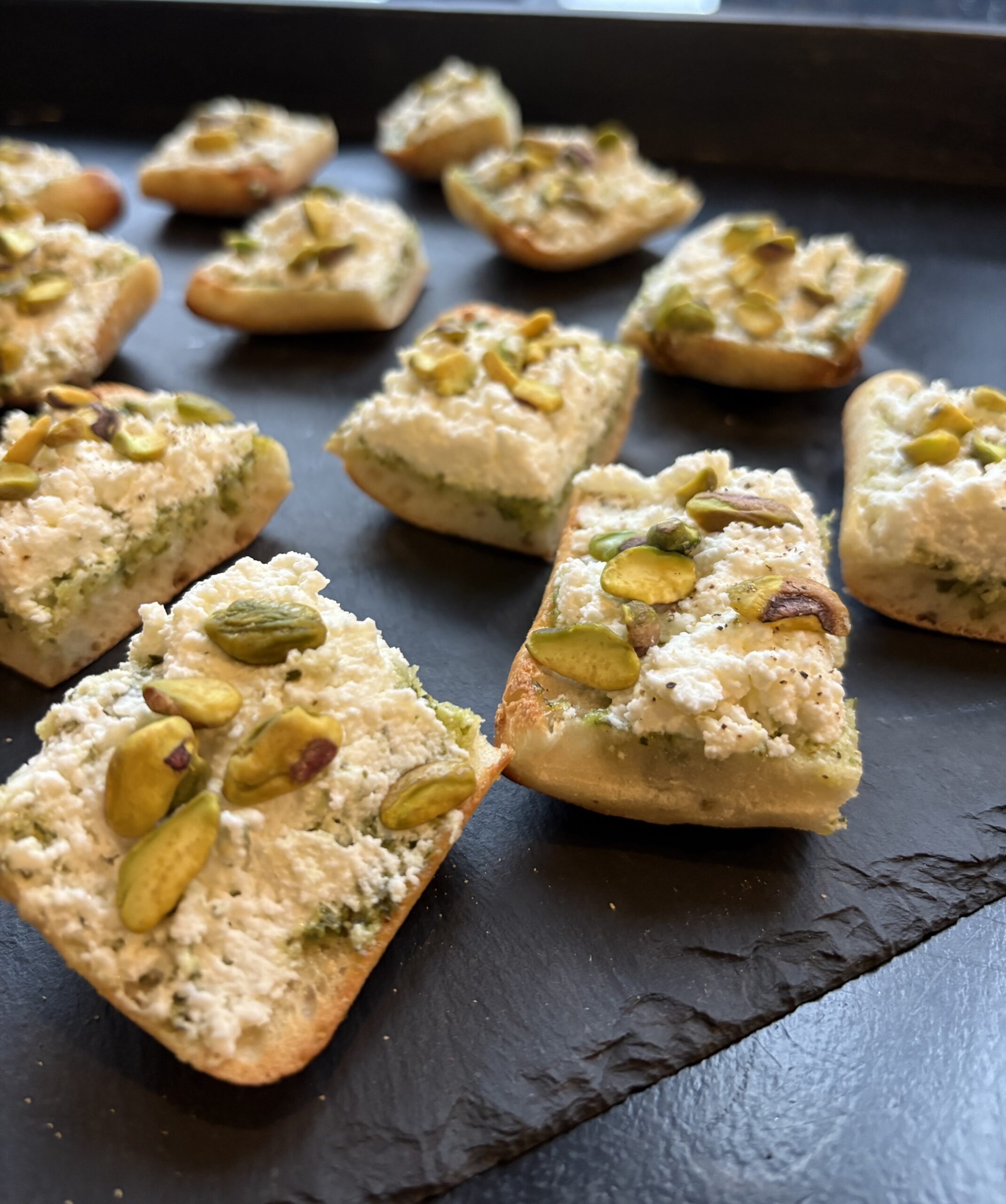 Ingrédients : baguette, pesto au basilic, ricotta et pistaches