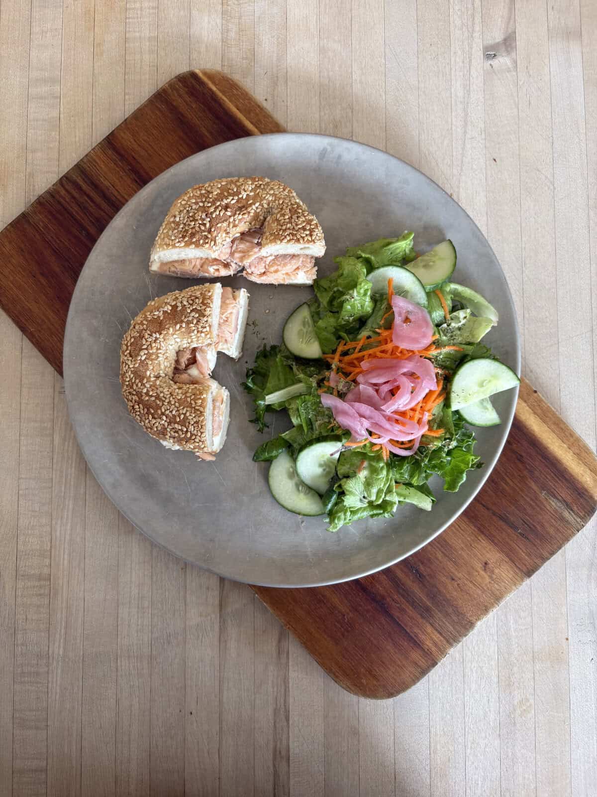 Bagel au Saumon : Bagel, beurre salé, saumon fumé à chaud maison et fromage à la crème. Accompagné de sa salade à côté et de 2 mini-beignets en dessert.