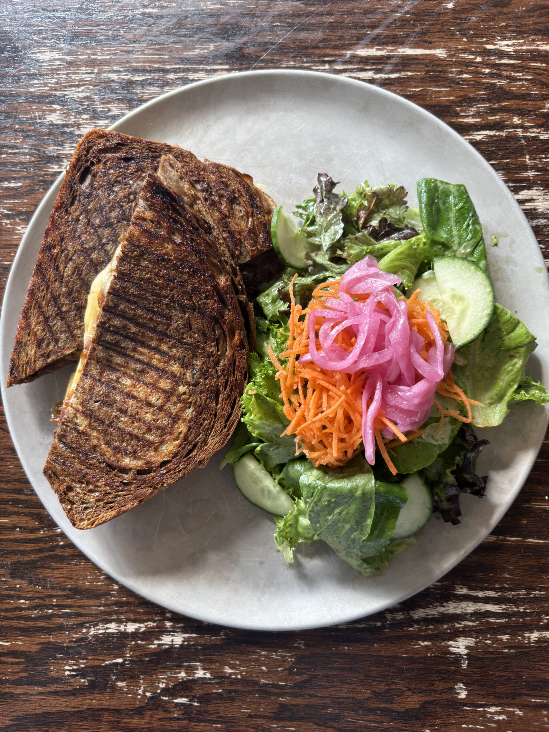 Grilled Cheese aux pommes : pain miche, beurre salé, cheddar emmental, pommes et oignons caramélisés. Accompagné de sa salade à côté et de 2 mini-beignets en dessert.