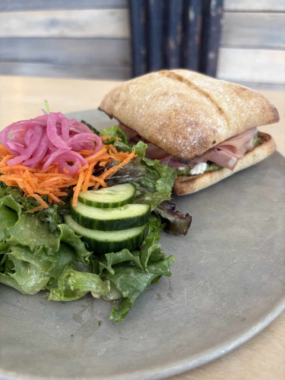 Sandwich l’italien : pain ciabatta, pesto, ricotta, mortadelle et pistaches. Accompagné de sa salade à côté et de 2 mini-beignets en dessert.