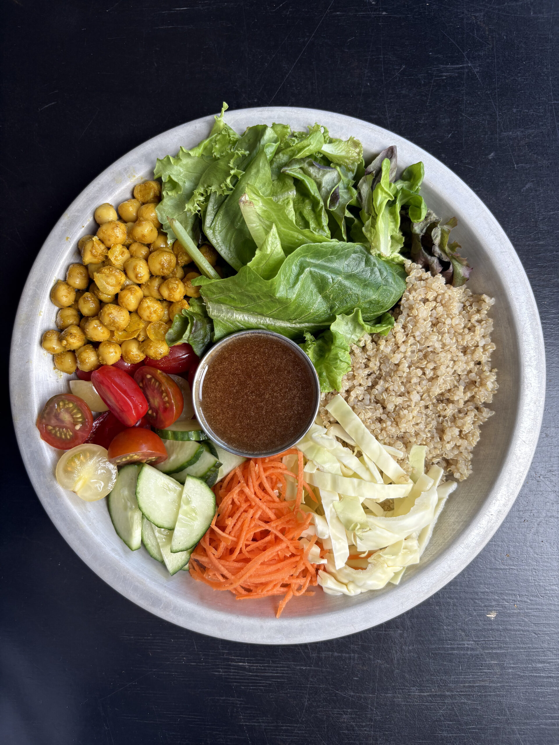 Salade Tahiti : quinoa, pois chiches marinés, chou vert, concombres, carottes rapées, laitue, tomates cerise et vinaigrette tahini faite maison. Accompagnée d’une barre croustillante vegane en dessert